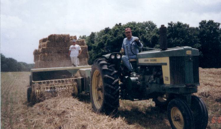 What a great summer activity...tedding hay with the 1957 John Deere 720 gasoline tractor. It was a beautiful early June day in 2008! It's hard to tell but this is some of the thickest hay dad has ever seen (135+ square bales/acre). |